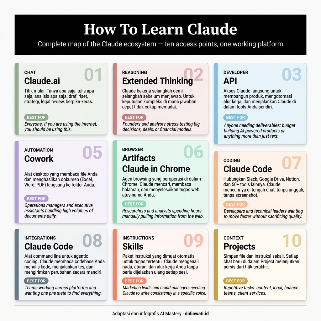 Infografis dari AI Mastery bertajuk “How To Learn Claude: Everything You Need to Know about Claude” ini memetakan ekosistem Claude secara utuh. Bukan sekadar chatbot, Claude kini hadir sebagai platform kerja dengan sepuluh titik akses yang masing-masing melayani kebutuhan berbeda. Mari kita telusuri satu per satu, persis seperti yang dipetakan di infografis ini.