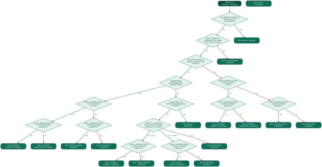 Untuk populasi yang tersebar dalam klaster geografis, misalnya, guru di berbagai sekolah binaan sebuah dinas pendidikan, diagram merekomendasikan cluster sampling (memilih beberapa klaster secara acak, lalu meneliti seluruh anggota klaster terpilih) atau multi-stage sampling (memilih klaster, lalu mengambil sampel di dalam klaster). Dalam konteks MSDM, multi-stage sampling cocok untuk riset berskala besar seperti survei nasional tentang praktik kompensasi: tahap pertama memilih provinsi, tahap kedua memilih perusahaan, tahap ketiga memilih karyawan.